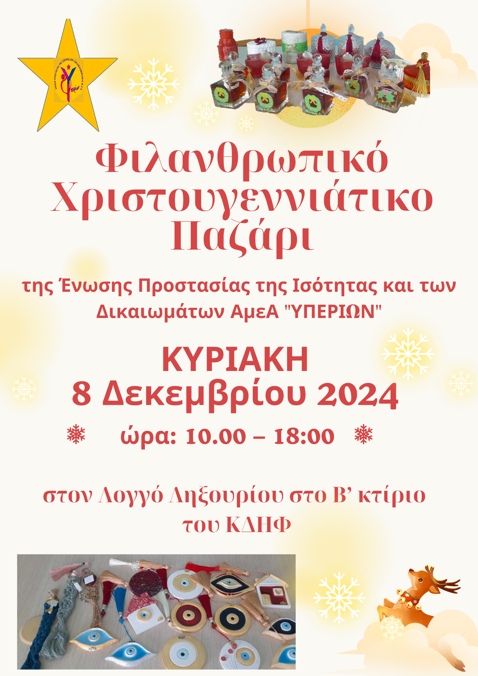 Φιλανθρωπικό χριστουγεννιάτικο παζάρι της Ένωσης Α.μεΑ. «ΥΠΕΡΙΩΝ» που θα πραγματοποιηθεί την Κυριακή 8 Δεκεμβρίου 2024 και ώρα 10:00 – 18:00