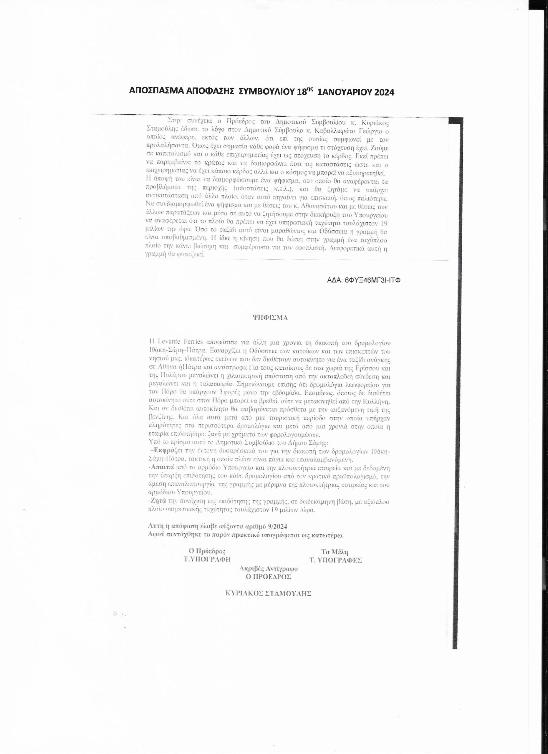 Στις 18 Ιανουαρίου 2024 με πρωτοβουλία της Λαϊκής Συσπείρωσης Δήμου Σάμης στο δημοτικό συμβούλιο μεταξύ των άλλων θεμάτων συζητήθηκε η διακοπή δρομολογίων του πλοίου  Ιθάκη-Σάμη-Πάτρα.