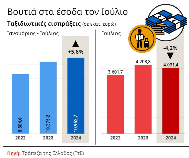 Σύμφωνα με την ΤτΕ, παρά την άνοδο των αφίξεων από το εξωτερικό κατά 4,1%, οι σχετικές εισπράξεις μειώθηκαν κατά 4,2%. Τα έσοδα από τον τουρισμό τον Ιούλιο ήταν 4,03 δισ. ευρώ από 4,20 δισ. ευρώ τον αντίστοιχο μήνα του προηγούμενου έτους. Στο επτάμηνο οι εισπράξεις από τον τουρισμό άγγιξαν τα 11 δισ. ευρώ, σημειώνοντας αύξηση σχεδόν 5,6% σε σύγκριση με το αντίστοιχο περσινό διάστημα, καθώς η τουριστική κίνηση σημείωσε αύξηση 11,1% το συγκεκριμένο διάστημα. Συγκεκριμένα, οι εισπράξεις από τον τουρισμό ανήλθαν στο επτάμηνο του 2024 στα 10,95 δισ. ευρώ από 10,37 δισ. ευρώ το χρονικό διάστημα Ιανουαρίου – Ιουλίου του 2023.