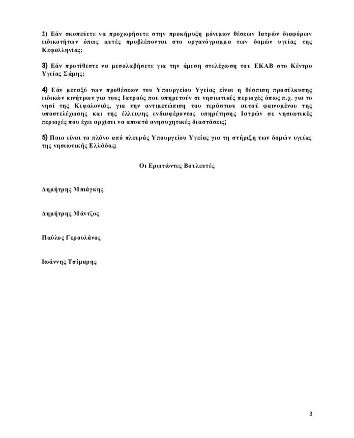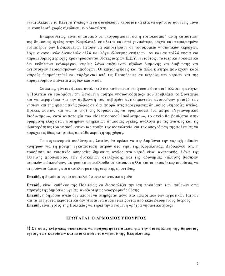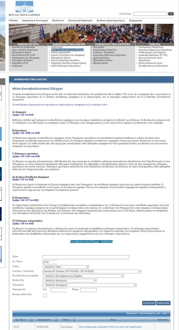 Από τις 19/8/2025 (!!!) σύμφωνα με την ιστοσελίδα της Βουλής των Ελλήνων μέχρι και σήμερα, καμία Απάντηση από τον Υπουργό Υγείας στην Ερώτηση των Βουλευτών του ΠΑ.ΣΟ.Κ. για τις ενέργειες στις οποίες προτίθεται να προχωρήσει για τη διασφάλιση της δημόσιας υγείας των κατοίκων και επισκεπτών της Κεφαλονιάς αλλά και τη προκήρυξη μονίμων θέσεων Ιατρών όπως αυτές προβλέπονται στο οργανόγραμμα των Δομών Υγείας του νησιού με παράλληλη θέσπιση ειδικών κινήτρων προσέλευσης τους.