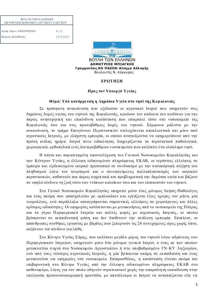 Μετά την πρόσφατη Ανακοίνωση των Αγροτικών Ιατρών του Γ.Ν. – Κ.Υ. Ληξουρίου και του Κ.Υ. Σάμης για παράνομες εντολές εφημέρευσης σε Αγροτικούς Ιατρούς προκειμένου να καλύψουν επιπλέον εφημερίες στο Γενικό Νοσοκομείο Κεφαλληνίας, αλλά και τη Καταγγελία του Σωματείου Εργαζομένων του Γ.Ν.Κ. για την ανυπαρξία σε σταθερή και συνεχόμενη βάση ιατρού στο ΤΕΠ, αναζητήσαμε την Απάντηση στην από 19/8/2025 Ερώτηση του ΠΑ.ΣΟ.Κ. προς τον Υπουργό Υγείας, Άδωνη Γεωργιάδη με θέμα: «Υπό κατάρρευση η Δημόσια Υγεία στο νησί της Κεφαλονιάς».