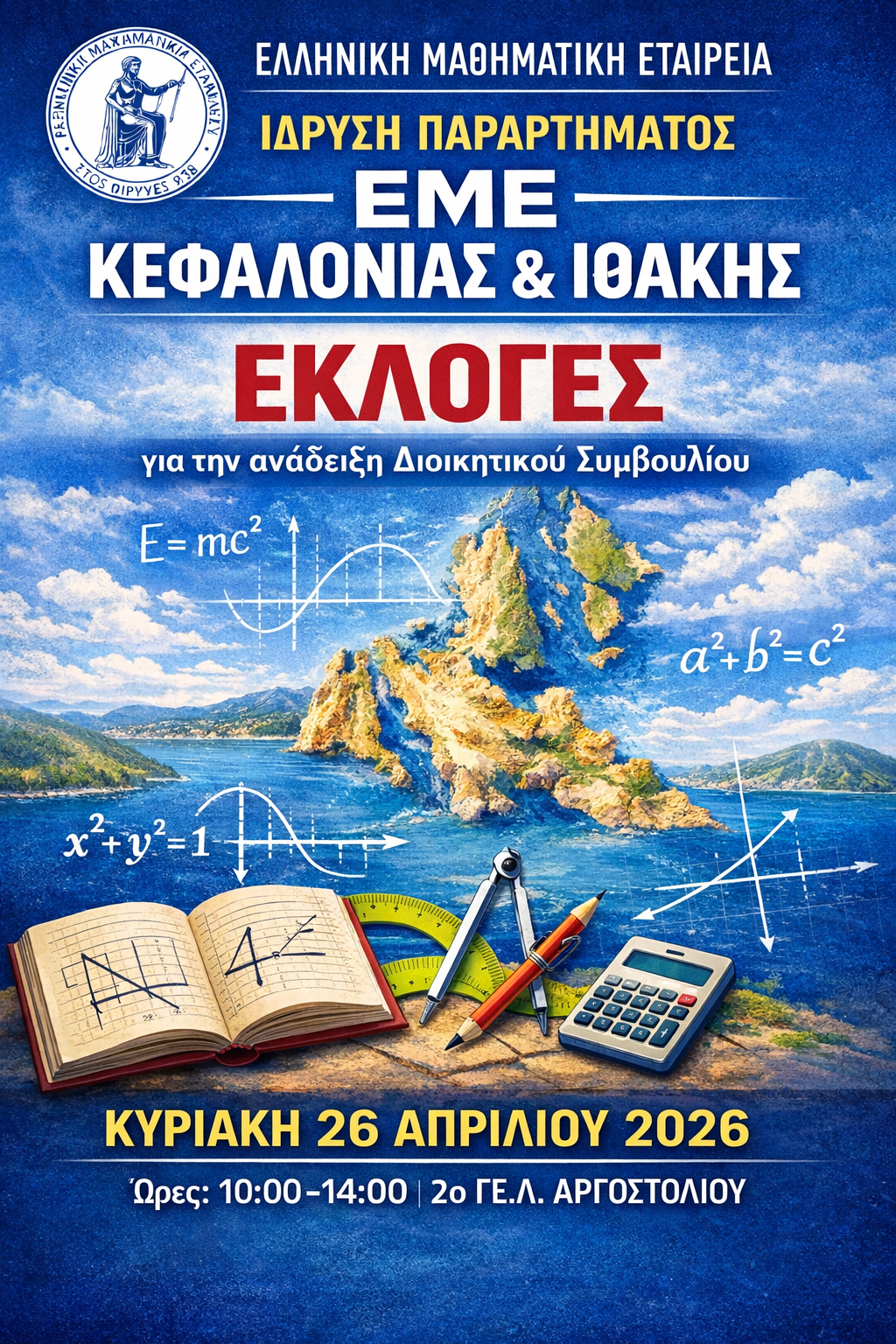 Πραγματοποιήθηκε στο Αργοστόλι την Κυριακή 19 Απριλίου και ώρα 11:30 πμ στο Δεύτερο Γ.Ε.Λ Αργοστολίου γενική συνέλευση ίδρυσης του παραρτήματος Κεφαλονιάς & Ιθάκης της Ελληνικής Μαθηματικής Εταιρείας.