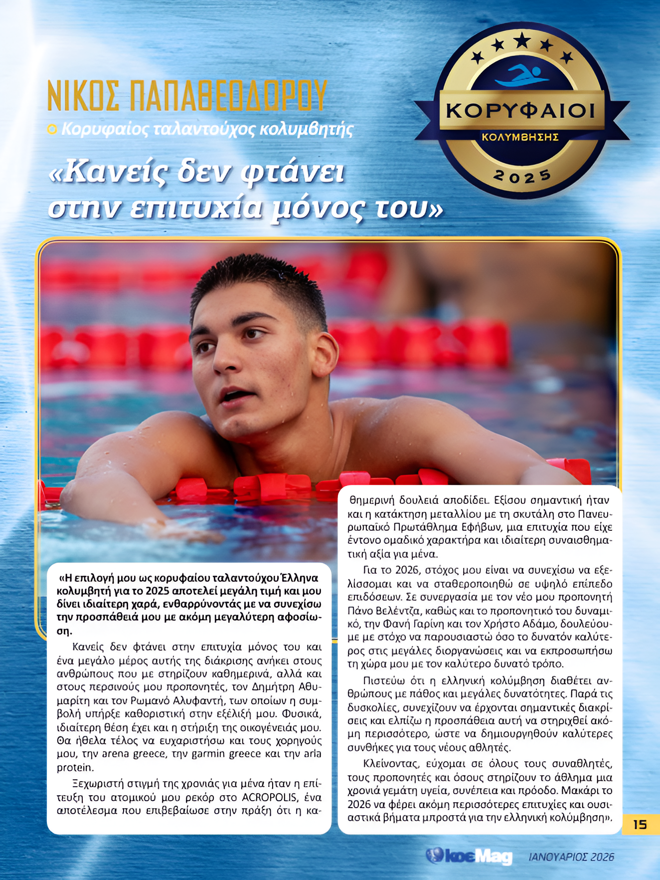 Κλείνοντας, εύχομαι σε όλους τους συναθλητές, τους προπονητές και όσους στηρίζουν το άθλημα μια χρονιά γεμάτη υγεία, συνέπεια και πρόοδο. Μακάρι το 2026 να φέρει ακόμη περισσότερες επιτυχίες και ουσιαστικά βήματα μπροστά για την ελληνική κολύμβηση».