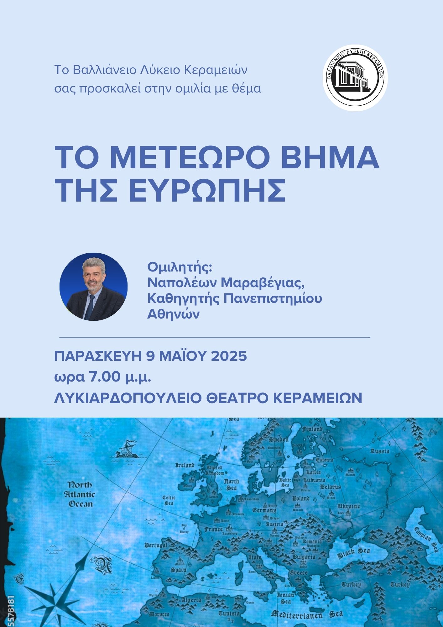 Το Βαλλιάνειο Γενικό Λύκειο Κεραμειών σας προσκαλεί να μας τιμήσετε με την παρουσία σας στην ομιλία του Καθηγητή του Εθνικού και Καποδιστριακού Πανεπιστημίου Αθηνών Ναπολέοντος Μαραβέγια, με θέμα: «Το μετέωρο βήμα της Ευρώπης», που θα πραγματοποιηθεί την Παρασκευή 9 Μαΐου 2025 και ώρα 07:00 το απόγευμα στο Λυκιαρδοπούλειο Θέατρο Κεραμειών.
