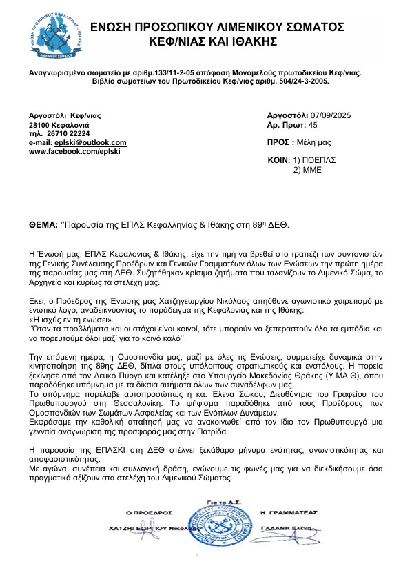 Παρουσία της ΕΠΛΣ Κεφαλονιάς & Ιθάκης στη 89η ΔΕΘ 7 Σεπτεμβρίου 2025 Tweet Share Pin It Share Ακολουθήστε το voutospress.gr στο Google News και μάθετε πρώτοι όλες τις ειδήσεις ΤΟ ΒΗΜΑ ΤΗΣ ΟΜΟΣΠΟΝΔΙΑΣ ΛΙΜΕΝΙΚΟΥ ΣΩΜΑΤΟΣ Διονύσιος Βούτος Δημοσιογράφος 45 χρόνια στην δημοσιογραφία. Δημοσιογράφος ΕΡΤ Σχετικά Άρθρα Φωτογραφίες και video από την επίσκεψη του ΠΘ στις πληγείσες περιοχές Η επίσκεψη διήρκεσε περίπου μία ώρα. Ο Πρωθυπουργός, επισκέφτηκε την Αργυρή Ακτή, το Ρέμα στο… Τουρισμός: Τα 3 «κλειδιά» που θα κρίνουν την πορεία της σεζόν ΧΑΡΗΣ ΝΤΙΓΡΙΝΤΑΚΗΣ Τα ρέστα τους πρόκειται να δώσουν οι τουριστικές επιχειρήσεις προκειμένου από τα μέσα… ΜΠΑΝΑΚΙ ΜΑΝΑΚΙ ΚΑΙ ΞΕΡΟ ΨΩΜΙ ΠΟΥ ΛΕΕΙ ΚΑΙ Ο ΛΑΟΣ !!!