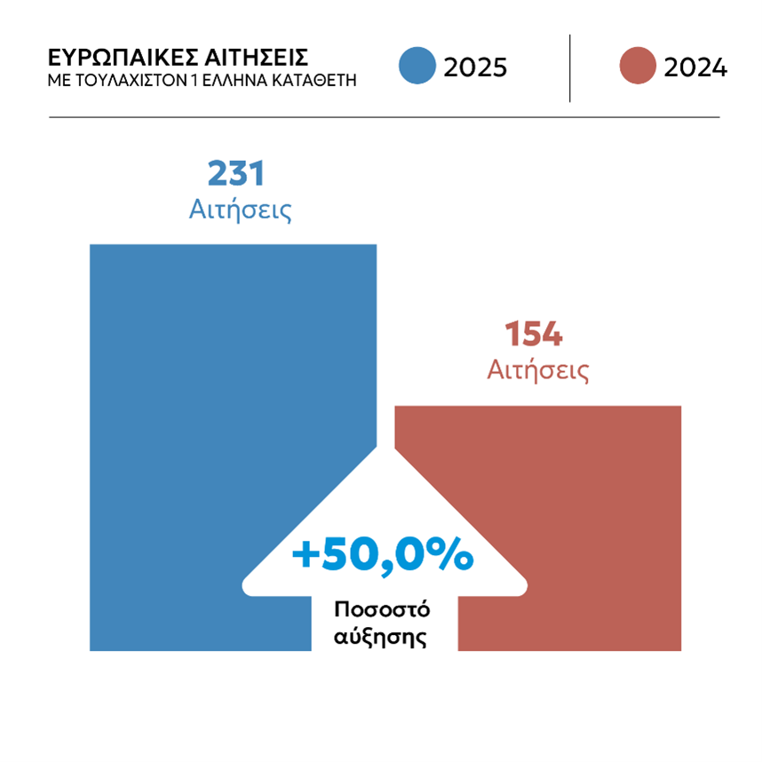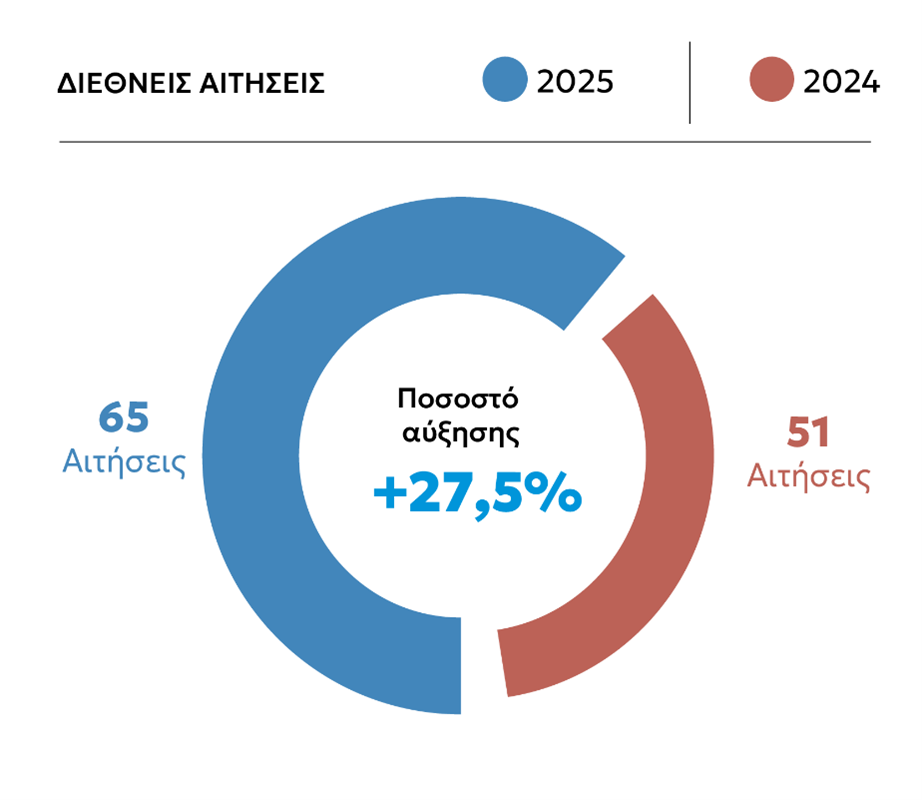 Κατατέθηκαν συνολικά 65 διεθνείς αιτήσεις με τουλάχιστον έναν Έλληνα δικαιούχο, έναντι 51 καταθέσεων, με τουλάχιστον έναν Έλληνα δικαιούχο, που παρελήφθησαν το 2024.