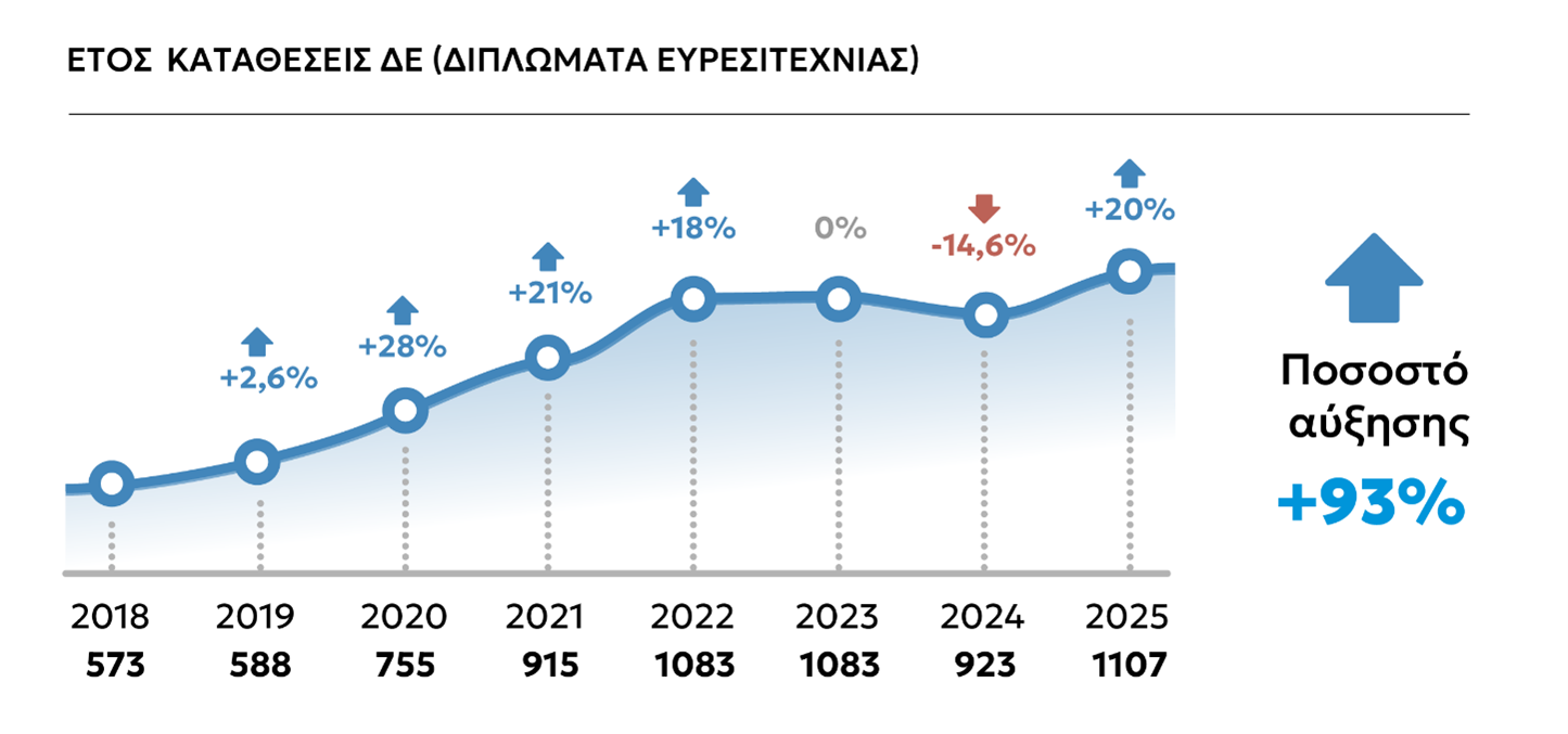 Σημαντική αύξηση καταθέσεων για Διπλώματα Ευρεσιτεχνίας (ΔΕ) και Εμπορικά Σήματα (ΤΜ) Νέο Εθνικό Ρεκόρ 1107 αιτήσεων για ΔΕ και το 2025