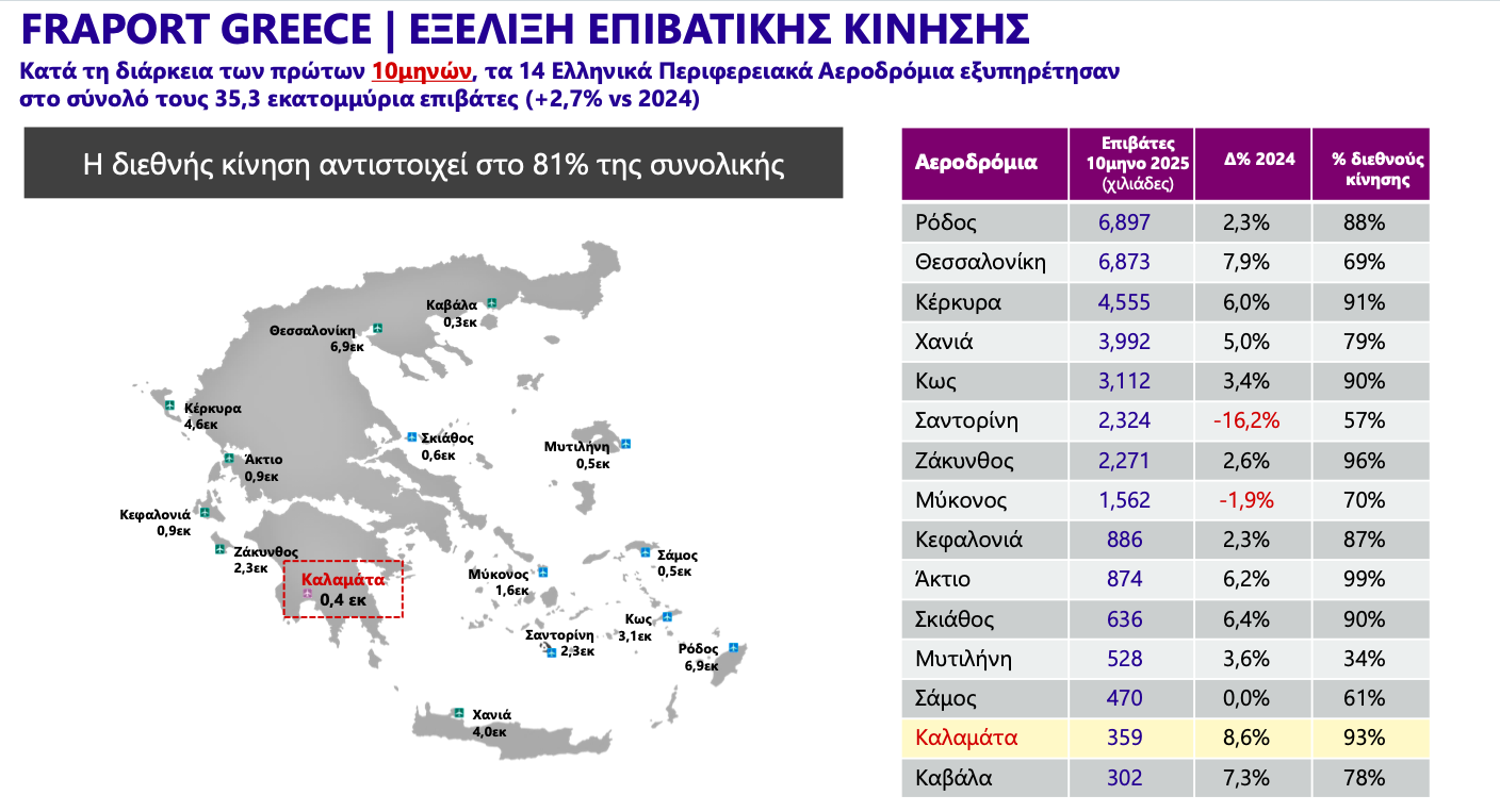 Η Fraport Greece παρουσίασε τα επίσημα στοιχεία για το πρώτο δεκάμηνο του 2025, επιβεβαιώνοντας τη σταθερά ανοδική πορεία των 14 περιφερειακών αεροδρομίων της χώρας, τα οποία εξυπηρέτησαν συνολικά 35,3 εκατομμύρια επιβάτες, σημειώνοντας αύξηση 2,7% σε σχέση με το 2024. Όπως τονίστηκε στην εκδήλωση ενημέρωσης με θέμα «Balancing Growth Through Shared Purpose», η διεθνής κίνηση αντιστοιχεί πλέον στο 81% του συνόλου, γεγονός που αναδεικνύει την ισχυρή εξάρτηση του ελληνικού τουρισμού από τις ξένες αγορές.