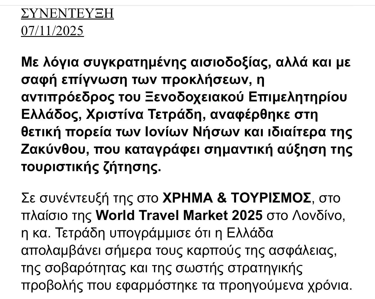Συγκρατημένη Αισιοδοξία λέει η κ Τετράδη για τον Τουρισμο 2026 8 Νοεμβρίου 2025 Tweet Share Pin It Share Ακολουθήστε το voutospress.gr στο Google News και μάθετε πρώτοι όλες τις ειδήσεις ΤΟ ΒΗΜΑ ΤΟΥ ΤΟΥΡΙΣΜΟΥ 2025 Διονύσιος Βούτος Δημοσιογράφος 45 χρόνια στην δημοσιογραφία. Δημοσιογράφος ΕΡΤ Σχετικά Άρθρα Σώθηκαν χιλιάδες ακίνητα! Η μεγάλη ανατροπή στις βραχυχρόνιες μισθώσεις Με μία αιφνιδιαστική αλλαγή της τελευταίας στιγμής, το νομοσχέδιο του Υπουργείου Τουρισμού που υπερψηφίστηκε στη… Π. Χρηστίδης: Η πίεση του ΠΑΣΟΚ οδηγεί την κυβέρνηση σε ρυθμίσεις για τις τράπεζες Την αργοπορημένη στάση της κυβέρνησης στο ζήτημα των τραπεζικών χρεώσεων, στηλίτευσε ο Παύλος Χρηστίδης Βουλευτής… Κεκάτος: Στο βιβλίο Γκίνες η αντιπολίτευση «Ούτε μία πρόταση δεν έχουν φέρει μέσα σε 5 χρόνια», είπε ο αντιδήμαρχος Τουρισμού για…