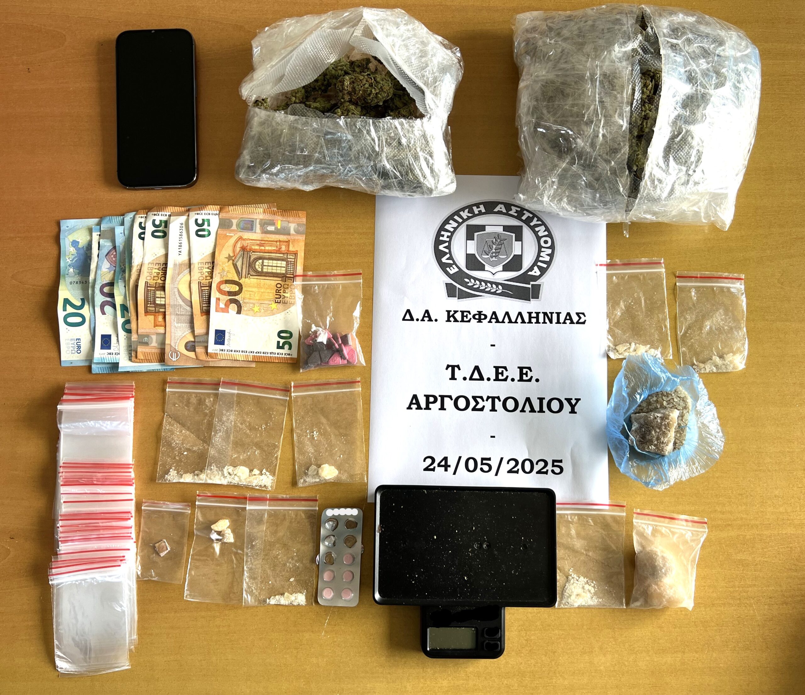 Κατά τις έρευνες, βρέθηκαν και κατασχέθηκαν, μεταξύ άλλων, -235- γραμμάρια ακατέργαστης κάνναβης, -77,6- γραμμάρια MDMA, – 24-ναρκωτικά δισκία εκ των οποίων-19- ecstasy, το χρηματικό ποσό των 370 ευρώ και -1- ζυγαριά ακριβείας