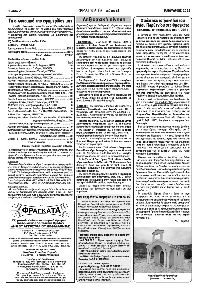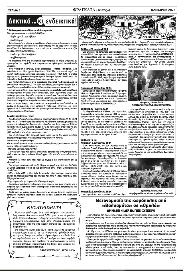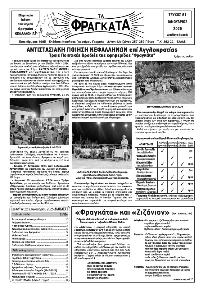 «Τα Φραγκάτα» Κεφαλλονιάς, Τεύχος 61ο –Ιαν. 2025 27 Ιανουαρίου 2025 Tweet Share Pin It Share Ακολουθήστε το voutospress.gr στο Google News και μάθετε πρώτοι όλες τις ειδήσεις ΤΟ ΒΗΜΑ ΤΗΣ ΕΦΗΜΕΡΙΔΑΣ ΦΡΑΓΚΑΤΑ Διονύσιος Βούτος Δημοσιογράφος 45 χρόνια στην δημοσιογραφία. Δημοσιογράφος ΕΡΤ Σχετικά Άρθρα ΚΕΝΤΡΟ ΠΡΟΛΗΨΗΣ ΤΩΝ ΕΞΑΡΤΗΣΕΩΝ ΚΑΙ ΠΡΟΑΓΩΓΗΣ ΤΗΣ ΨΥΧΟΚΟΙΝΩΝΙΚΗΣ ΥΓΕΙΑΣ ΚΕΦΑΛΛΗΝΙΑΣ – ΙΘΑΚΗΣ «Απόπλους» Βαδίζοντας προς το τέλος μιας δύσκολης χρονιάς που σηματοδοτεί τη συμπλήρωση σχεδόν δύο χρόνων όπου… Ν.Ε ΣΥΡΙΖΑ: Απολογισμός της επίσκεψης-φιάσκο του πρωθυπουργού και η ωμή πραγματικότητα Η Κεφαλονιά υποδέχθηκε χθες τον χειρότερο πρωθυπουργό που είδε η χώρα από την μεταπολίτευση και… Κεφαλονίτης Όνος: 6,5 εκατομμύρια για λιμάνια σε Κεφαλονιά και Ιθάκη –Ο Πόρος εκτός σχεδίου! Δεν μπορούσα να το πιστέψω! Χρηματοδοτεί η Κυβέρνηση με 6.500.000 Λιμάνια στην Κεφαλονιά και την…
