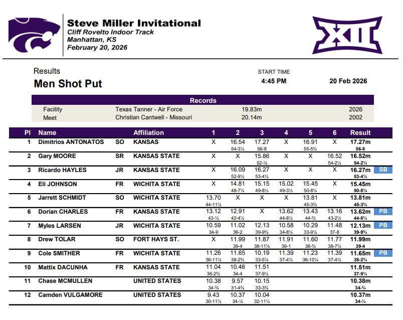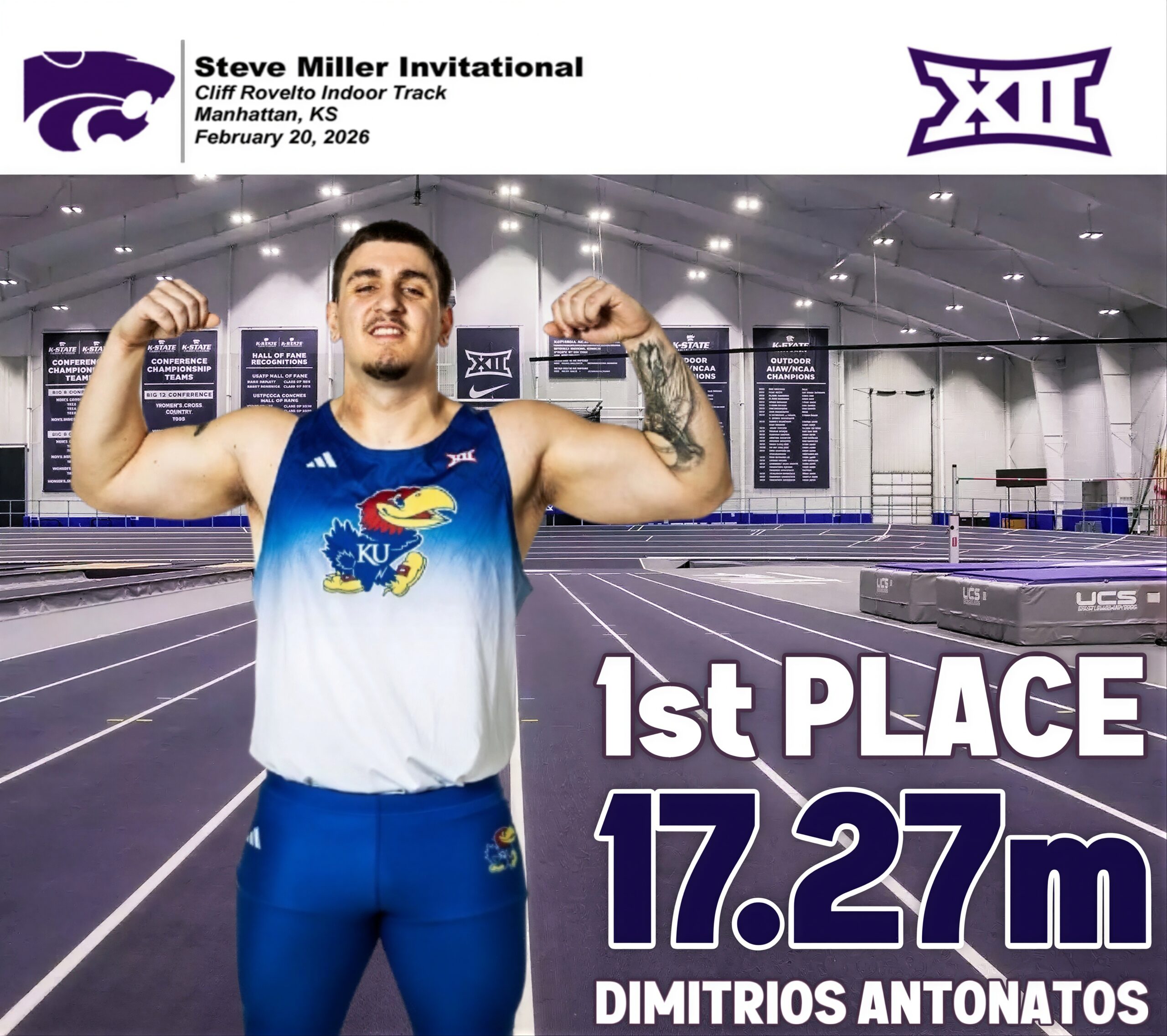 Στο Steve Miller Invitational( Manhattan, KS) αγωνίστηκε απόψε ο Δημήτρης Αντωνάτος και ρίχνοντας στην 3η του προσπάθεια 17.27μ κατέλαβε την 1η θέση στον αγώνα.