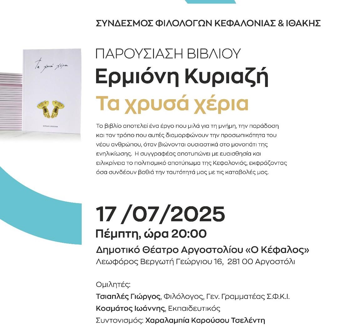 Το βιβλίο έχει τίτλο τα Χρυσά χέρια, μιλά για την παράδοση και τη ζωή της γιαγιάς της συγγραφέως με τη γιαγιά της στη Κεφαλονιά. 16 Ιουλίου 2025 Tweet Share Pin It Share Ακολουθήστε το voutospress.gr στο Google News και μάθετε πρώτοι όλες τις ειδήσεις ΤΟ ΒΗΜΑ ΤΟΥ ΒΙΒΛΙΟΥ Διονύσιος Βούτος Δημοσιογράφος 45 χρόνια στην δημοσιογραφία. Δημοσιογράφος ΕΡΤ Σχετικά Άρθρα Συλλυπητήριο μήνυμα για την απώλεια του Διονύση Λευκαδίτη Ο Δήμος Σάμης εκφράζει τη βαθύτατη θλίψη του για την απώλεια του πρώην Νομάρχη Κεφαλονιάς… ΚΙΝΗΜΑ ΔΗΜΟΚΡΑΤΙΑΣ ΚΕΦΑΛΟΝΙΑΣ ΚΑΙ ΙΘΑΚΗΣ KΕΦΑΛΟΝΙΑ 3/1/2025 ΓΕΦΥΡΑ ΧΕΙΜΩΝΙΚΟΥ ΕΓΚΛΗΜΑ ΠΕΡΙΒΑΛΟΝΤΙΚΟ & ΟΙΚΟΝΟΜΙΚΟ . Έχουν περάσει 52 μήνες από την… ΕΟΡΤΑΣΜΟΣ ΕΘΝΙΚΗΣ ΕΠΕΤΕΙΟΥ 28ης ΟΚΤΩΒΡΙΟΥ 1940 ΘΕΜΑ: « Εορτασμός της Εθνικής Επετείου της 28ης Οκτωβρίου 1940». ΣΧΕΤ: Το αριθ. πρωτ.: 88323/13.10.2023,…