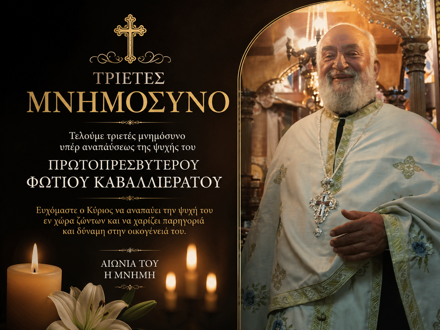 Η οικογένεια του μακαριστού Πρωτοπρεσβυτέρου Φωτίου Καβαλιεράτου ανακοινώνει ότι, την Κυριακή 3/05/2025, θα τελέσει το ΤΡΙΕΤΕΣ Ιερόν Μνημόσυνο αυτού, εις τον Ι. Ενοριακό Ναό Εισοδίων της Θεοτόκου – Σισσιώτισσας Αργοστολίου και ώρα 10:00 π.μ.
